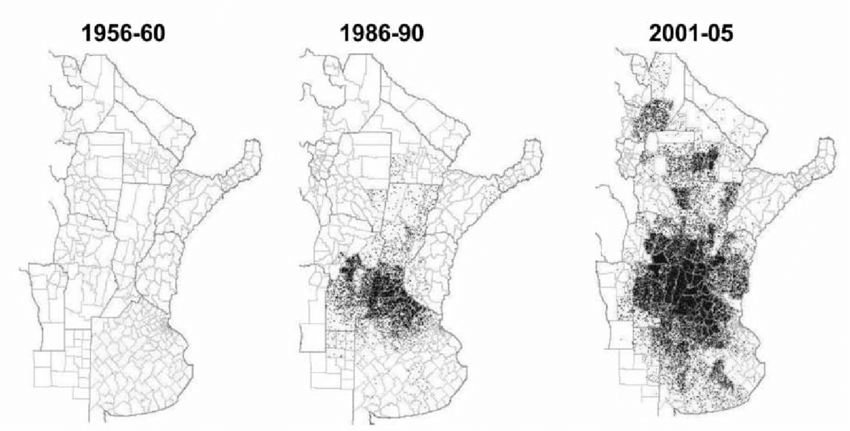 In recent decades, the Argentine agricultural model has undergone an unprecedented intensification, driven by the adoption of genetically modified seeds, no-till farming, and monoculture —particularly of soybeans— within a highly profitable technological package. This process, known as “Pampasization”, involved not only a dramatic increase in production —for example, from 12.5 million tons of soybeans in 1995 to nearly 39 million in 20051— but also a significant expansion of agriculture, as well as the expansion into areas outside the Pampas, with growth rates of the cultivated area of up to 220% in the NOA and 417% in the NEA between 1997/98 and 2004/05.