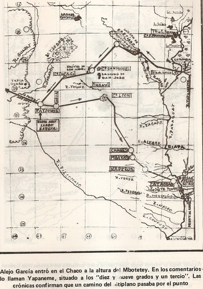 After being expelled from Martín García Island by the Portuguese around 1526, Alexo García landed in Santa Catarina, where he joined Guarani communities who adopted him as their leader. From there, he embarked on an extensive inland journey accompanied by some two thousand Guarani, crossing what would later become Paraguay for the first time by a European and making contact with the famous Peabirú road, which connected the Atlantic with the territory of Tawantinsuyo (the Inca Empire). He reached peripheral areas of the Inca Empire, where he obtained news and riches, but on his return, he was killed by rival indigenous groups, leaving his expedition as one of the first European attempts to reach the heart of South America.